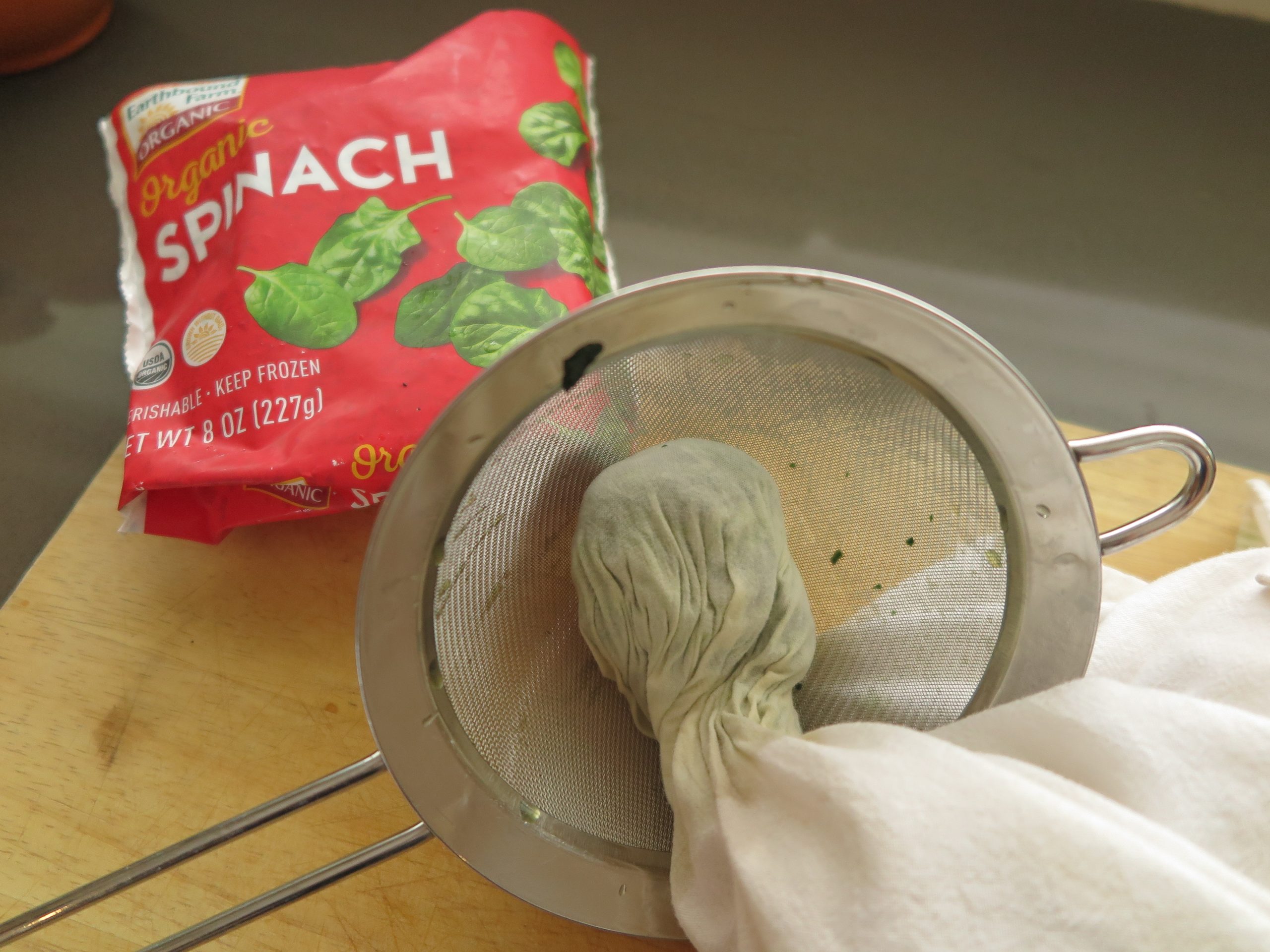 Spinach – To thoroughly drain, wrap spinach in a clean rag and squeeze till most the moisture comes out.
