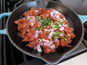 - Cook for 10 minutes (stirring occasionally) or until chorizo is fully cooked and onions lightly toasted. Drain. Set to the side to cool.