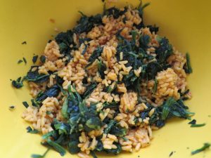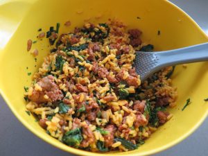 - Add the chorizo to the rice/spinach mixture.