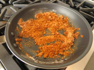 - In a 10-inch nonstick skillet, heat canola oil over medium low heat until oil sizzles when you add a couple drops of water. Add the garlic and cook for 30 seconds. Add the bowl of flour and spices to the skillet, stirring for 2-3 minutes.