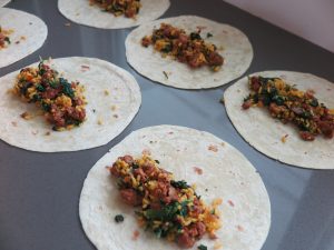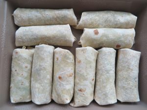 - Layout 10 tortillas. Equally divide the rice mixture into each tortilla. Place in the middle of the tortilla forming a long tube ending about 1 ½ inches from each side.
