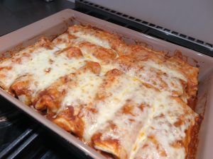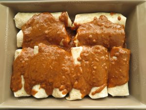 - Roll enchiladas in sauce so they are thoroughly covered in the sauce.