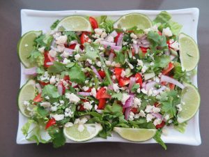 - Combine all the ingredients (except the lime juice a sea salt). Place on a large platter. Drizzle with lime juice and sea salt just before serving.