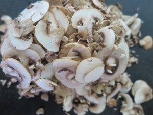 - While mushrooms are soaking, brush dirt from the cremini mushrooms with a mushroom brush or paper towel. Cut off bottom of mushroom stem. Slice thinly in a food processor or with a knife. Set to the side.