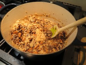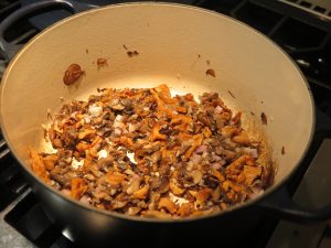 - Add the browned mushroom mixture and the hydrated chanterelle mushrooms to the risotto.