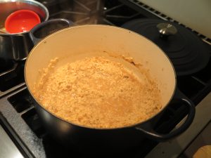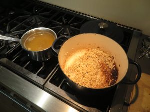 - Add 2 cups of warmed mushroom stock, stirring every 2-3 minutes until the stock is absorbed. Continue adding stock, 1 cup at a time, allowing stock to absorb before adding more. Stir occasionally to ensure the rice does not stick to the bottom of the pan. The risotto is done once it is chewy to the bite and tender inside. You will not be using all the mushroom broth, you’ll have about a cup or so left.