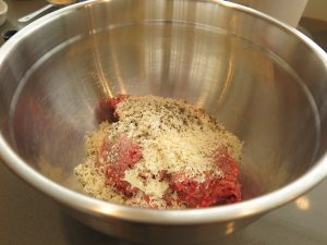 - In a large bowl combine ground beef, cooled vegetables with the melted butter, breadcrumbs, parmesan, beaten eggs, Worcestershire, salt and pepper. Gently mix with your hands.