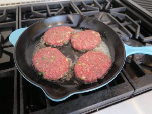 - Reheat the large sauté pan you used for the vegetables over medium heat. Add a tablespoon of butter. Once the butter is melted and bubbling, add the patties. Sear for 2 minutes on the first side.