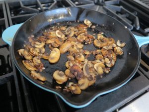 - In the heated pan (medium heat), deglaze the pan with the vermouth, scraping the brown bits from the pan. Add the butter. Once melted, add the sliced mushrooms. Cook until they are golden brown on both sides, for about 7 minutes.