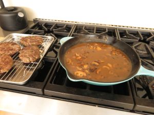 It might be somewhat of a surprise, but Salisbury Steak was created for its health benefits. Dr. James Salisbury was very interested in the connection of food to health back in the late 1800’s. He researched, with sometimes some unlucky individuals, having them eat certain foods for extended periods of time to evaluate the diet to their health. The “Beans and Coffee” group not as lucky as the “Oatmeal” group. The real winners were the “Steak” group. They showed great health improvements. He took his research to the Union Army during the Civil War. Health was improved with the addition of lean beef to their diet.Over the years Salisbury Steak has come in and out of favor. I thought it would be fun to revisit it and vanish the memory of TV dinners back in the 60’s. I even thought about renaming it, so you didn’t snub your nose at my recipe. But after reading about Dr. Salisburg, I felt he deserved recognition for all his research and forward thoughts on the relationship between our health and what we eat.Another driving force in this recipe was to create something for a cold winter night that was made in one pan with not a whole lot of effort. I created elevated beef patties smothered in a rich flavor packed mushrooms sauce. Adding sautéed shallots, garlic and scallions keep the patties moist as they simmer in the sauce. Serve it over whipped potatoes or pappardelle noodles. A side of steamed broccoli or broccolini drizzled with lemon juice and olive oil will be a perfect compliment to the richness of the dish.