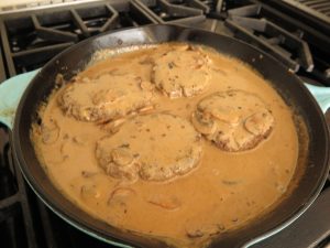 - Add the patties and spoon sauce over the top. Cover and cookfor 10 more minutes. Flip the patties after 5 minutes and spoon more sauce over the top. Patties should reach an internal temperatureof 165 degrees.Serve over whipped potatoes, pappardella pasta or egg noodles.