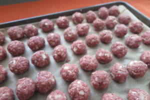 - Line a baking sheet with parchment paper. Roll into ¾ -1 inch balls and place on the baking sheet leaving air space between the meatballs.